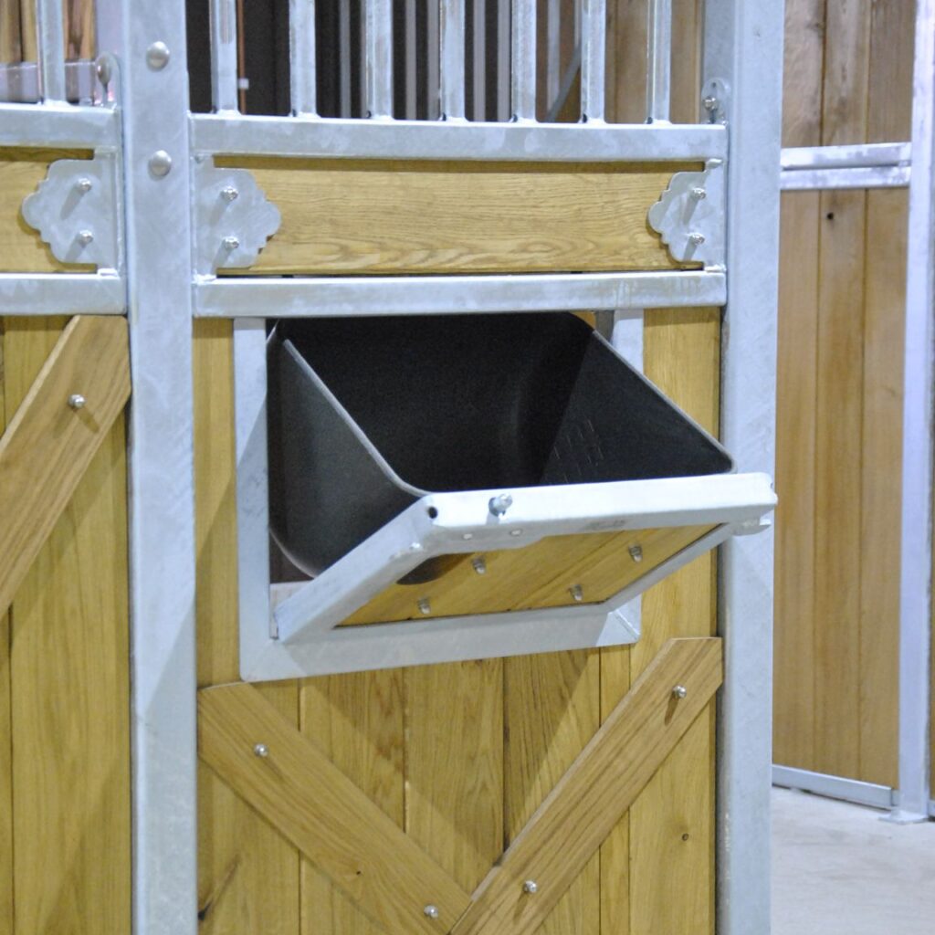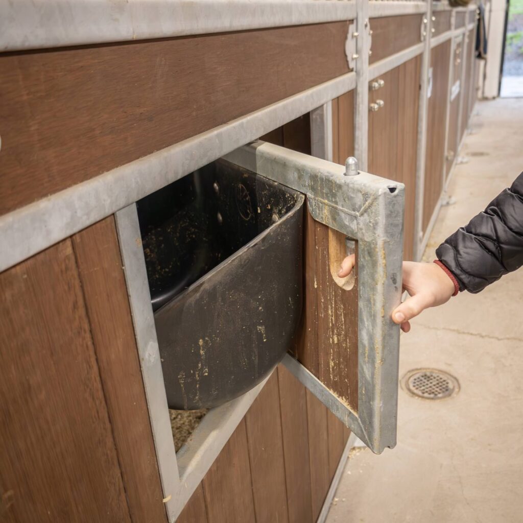 Svängbar ram inklusive svart foderkrubba av plast gör det enkelt att utfodra dina hästar utan att behöva gå in i boxen.