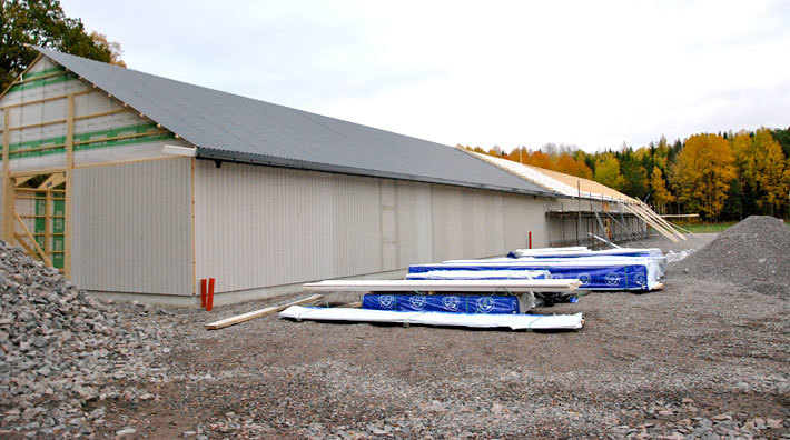 Stallet från Ydre-Grinden kommer i färdiga väggblock där ytterpanel och vindpapp redan är på plats. Blocken monteras sedan ihop, vilket gör att byggnaden snabbt blir tät och det blir enkelt att fortsätta arbetet inomhus.
