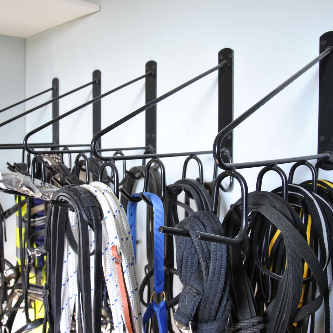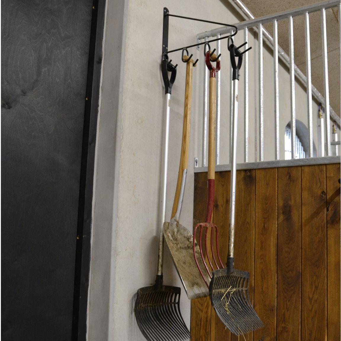 Redskapshängare med plats för fyra redskap. Kan även med fördel användas till träns, grimmor etc.