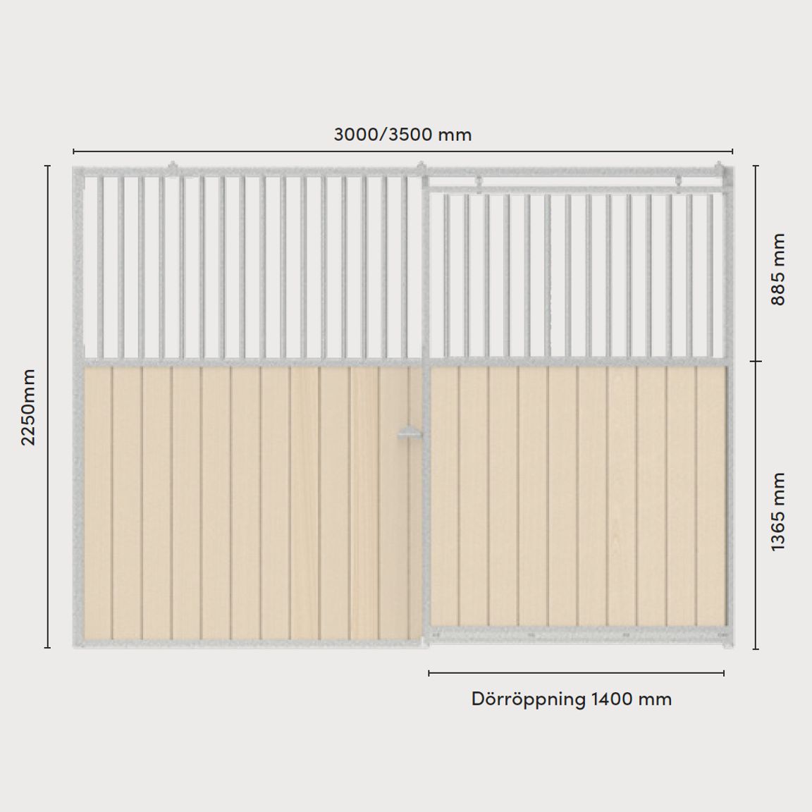 Tänk på att front och mellanvägg är tillverkade med fasta mått på 3 meter eller 3,5 meter och därför finns ingen justeringsmöjlighet.