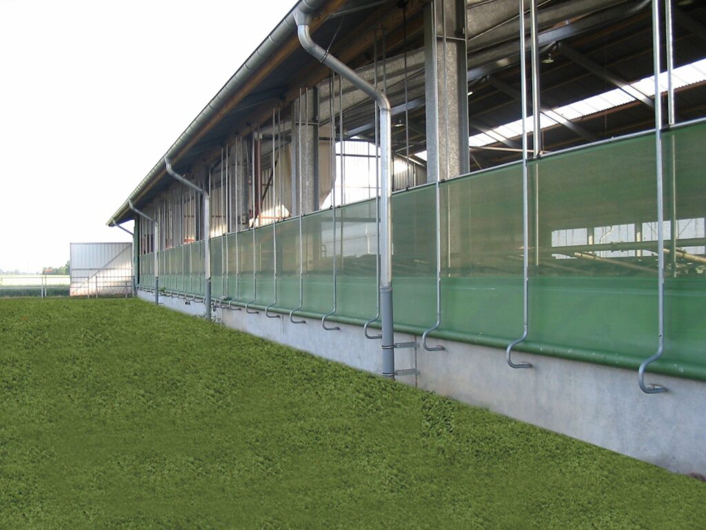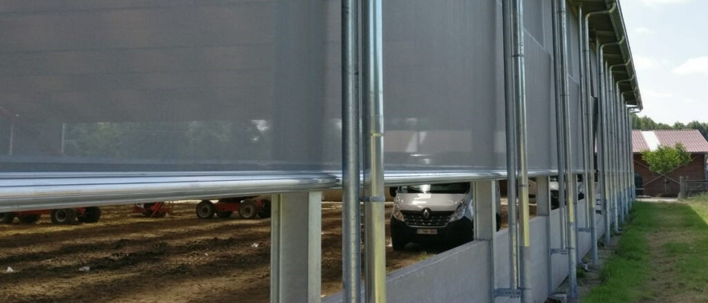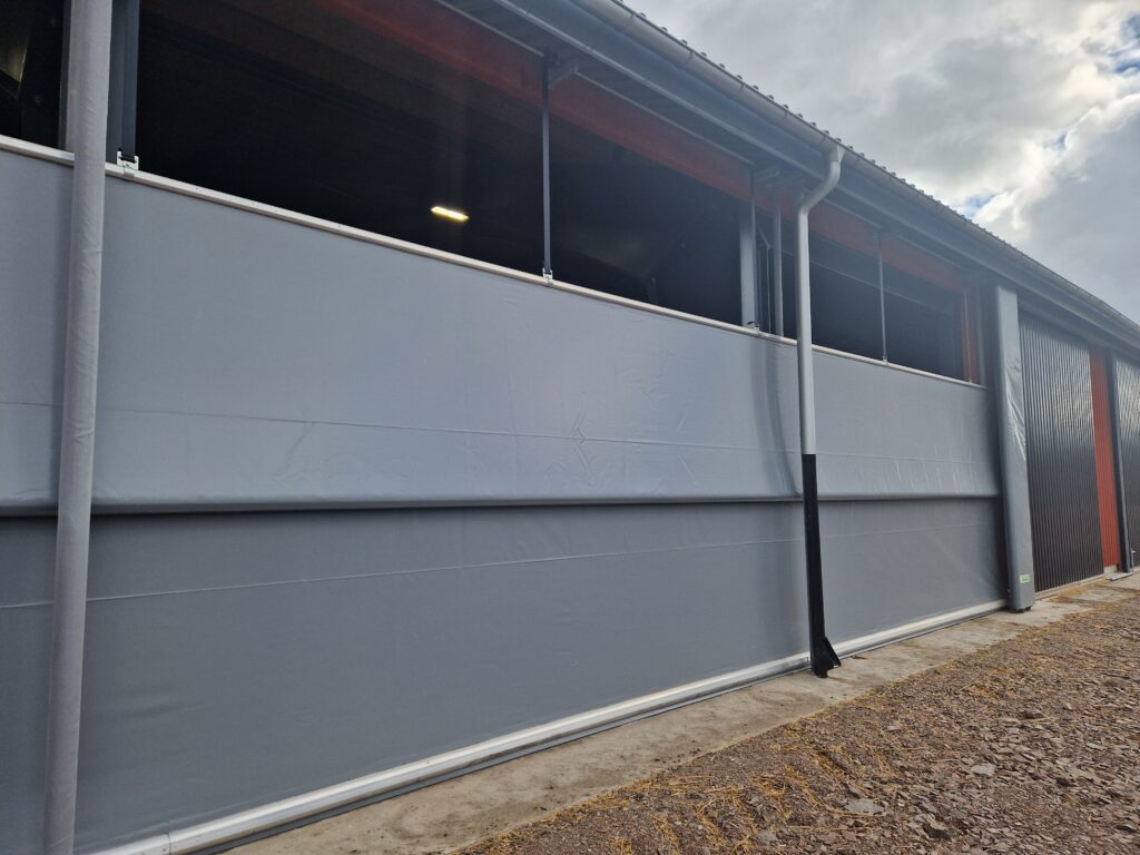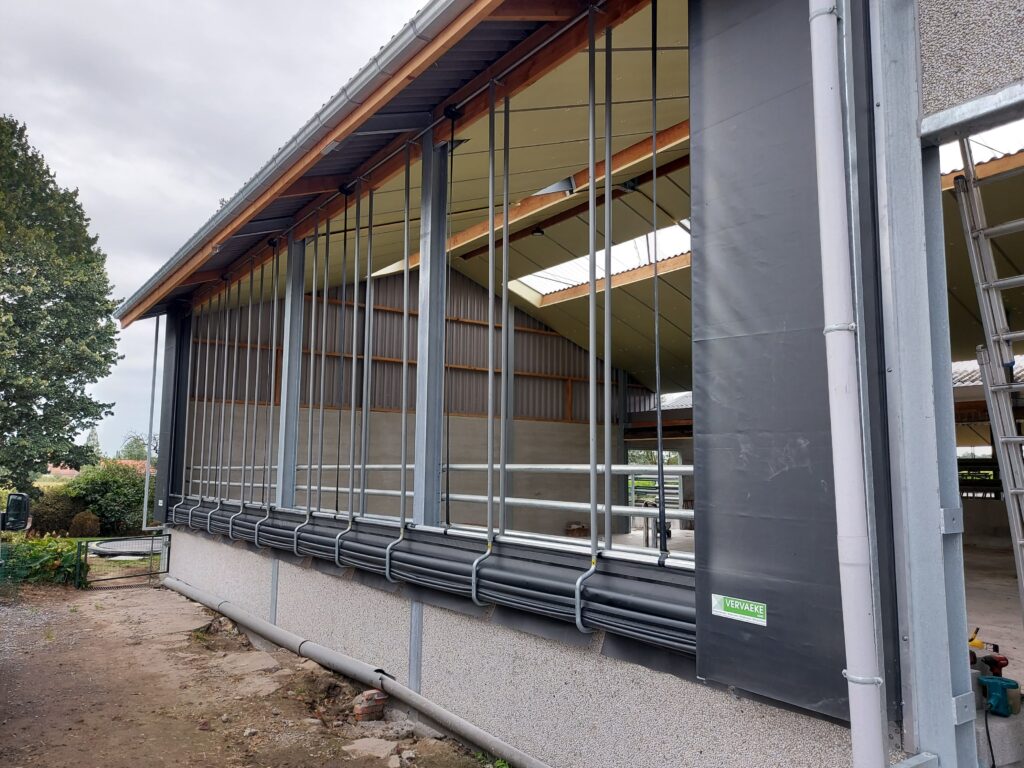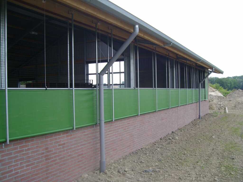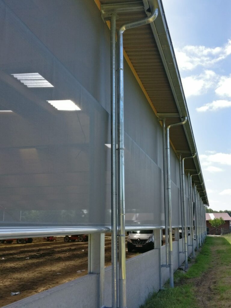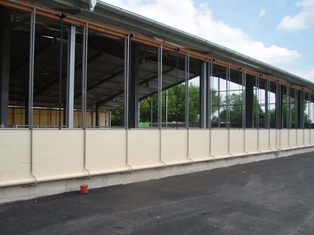 Effektiv sidogardin som öppnar i nederkant. Kan exempelvis användas där man förutom ventilation vill kunna köra in med fordon. Gardiner som öppnas nedifrån och rullas uppåt levererar sval och frisk luft direkt vid djurens nivå och skapar ett jämnt, naturligt ventilationsflöde.