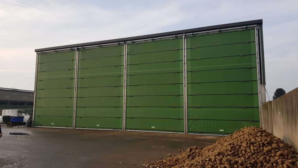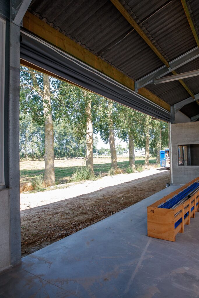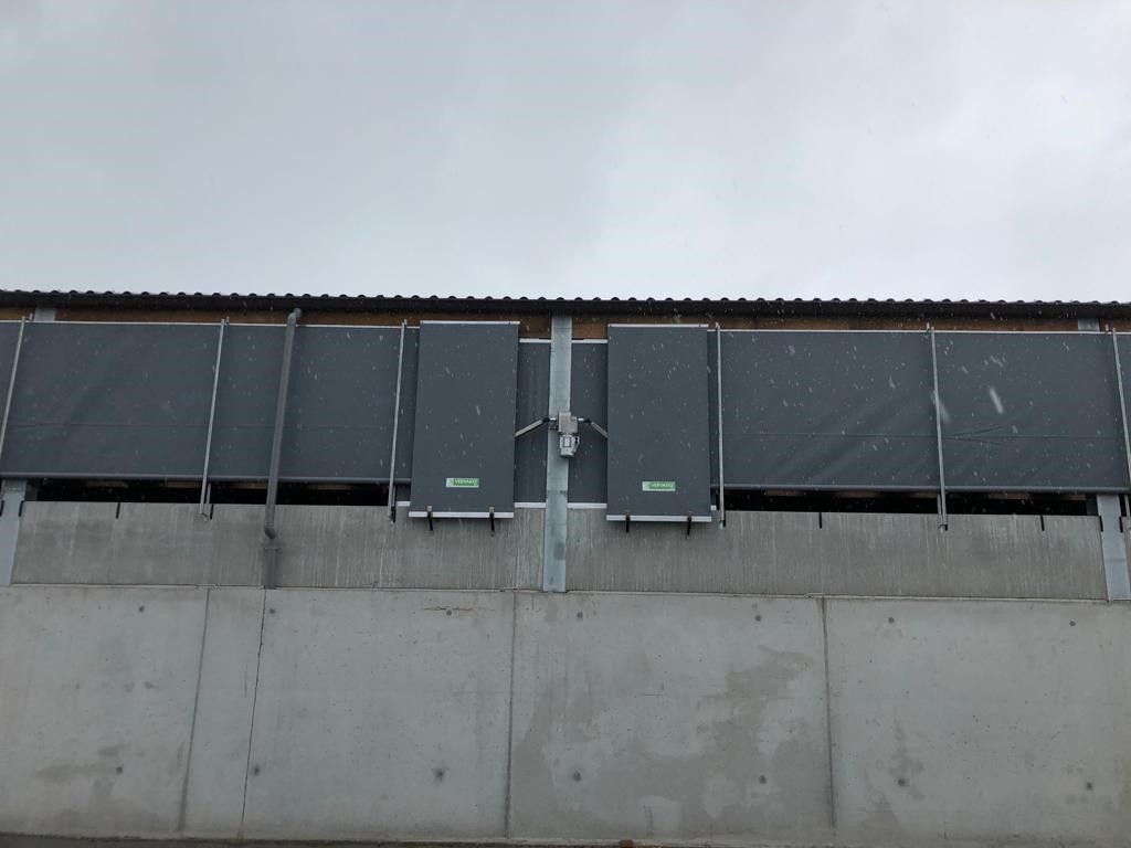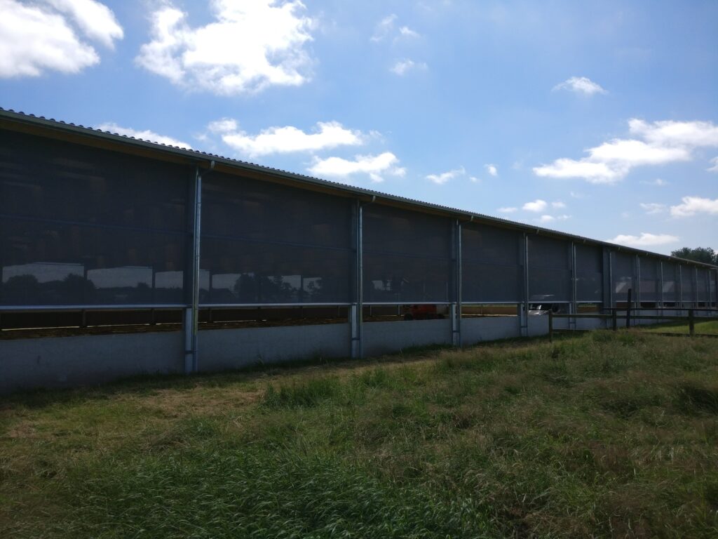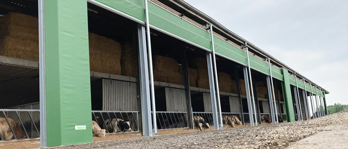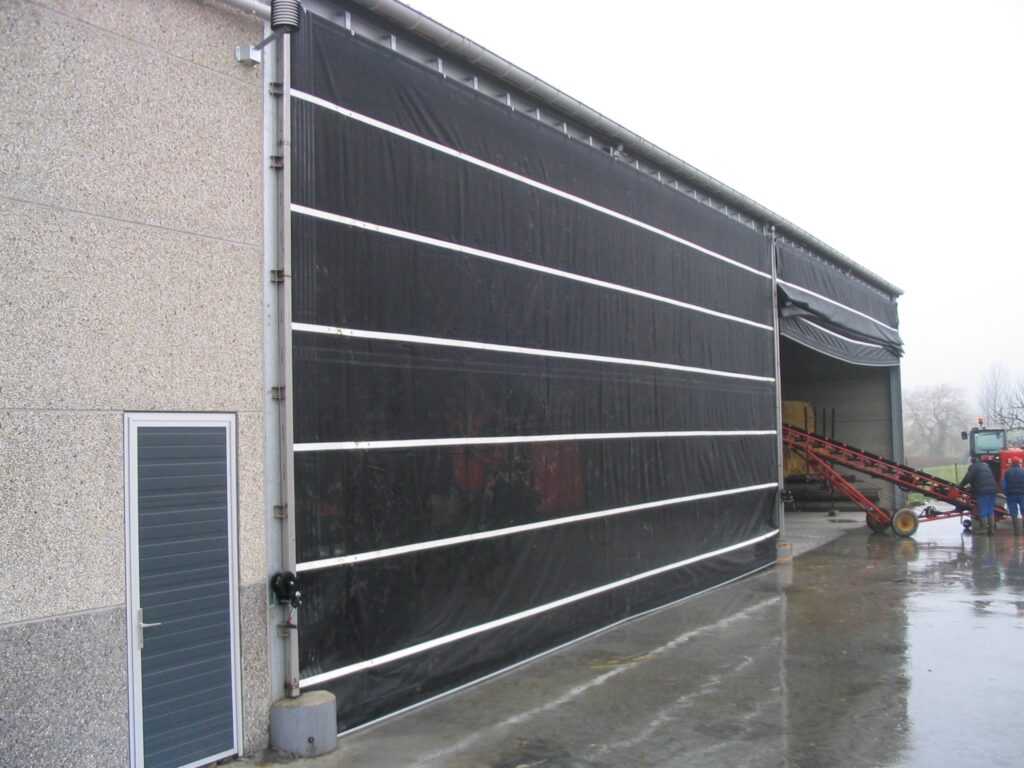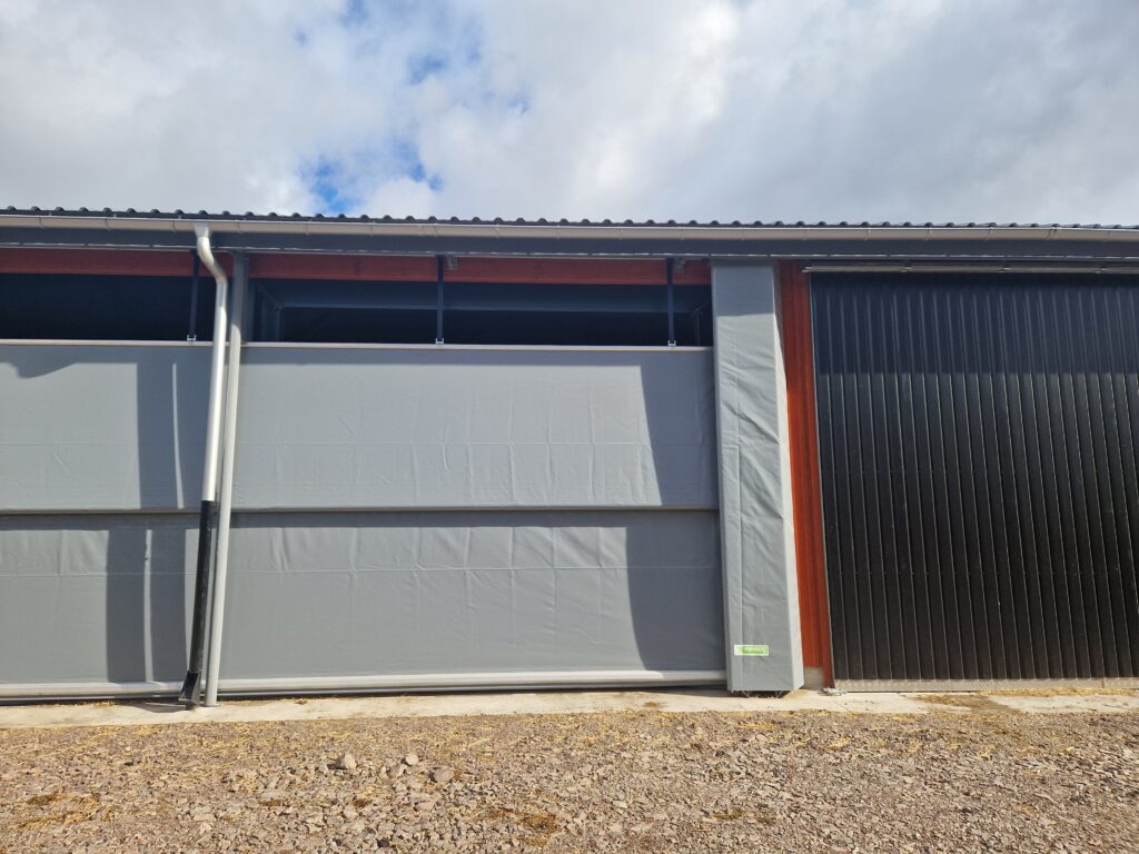 Effektiv sidogardin som öppnar i nederkant. Kan exempelvis användas där man förutom ventilation vill kunna köra in med fordon. Gardiner som öppnas nedifrån och rullas uppåt levererar sval och frisk luft direkt vid djurens nivå och skapar ett jämnt, naturligt ventilationsflöde.